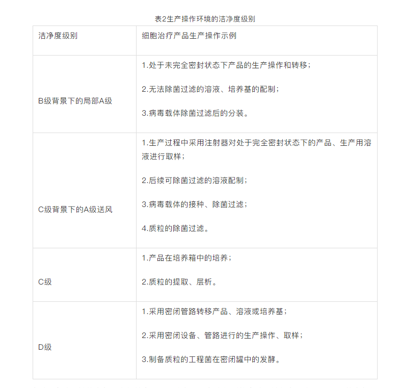 CAR-T細(xì)胞治療產(chǎn)品、病毒載體和質(zhì)粒的生產(chǎn)應(yīng)當(dāng)分別在各自獨(dú)立的生產(chǎn)區(qū)域進(jìn)行,并配備獨(dú)立的空調(diào)凈化系統(tǒng)。采用密閉設(shè)備、管路進(jìn)行細(xì)胞治療產(chǎn)品的生產(chǎn)操作;密閉設(shè)備、管路安置環(huán)境的潔凈度級(jí)別可適當(dāng)降低。同一生產(chǎn)區(qū)域有多條相同的生產(chǎn)線,且采用隔離器的,每個(gè)隔離器應(yīng)當(dāng)單獨(dú)直接排風(fēng)。細(xì)胞治療產(chǎn)品、病毒載體、質(zhì)粒的生產(chǎn)操作環(huán)境的潔凈度級(jí)別,可參照表格中的示例進(jìn)行選擇。