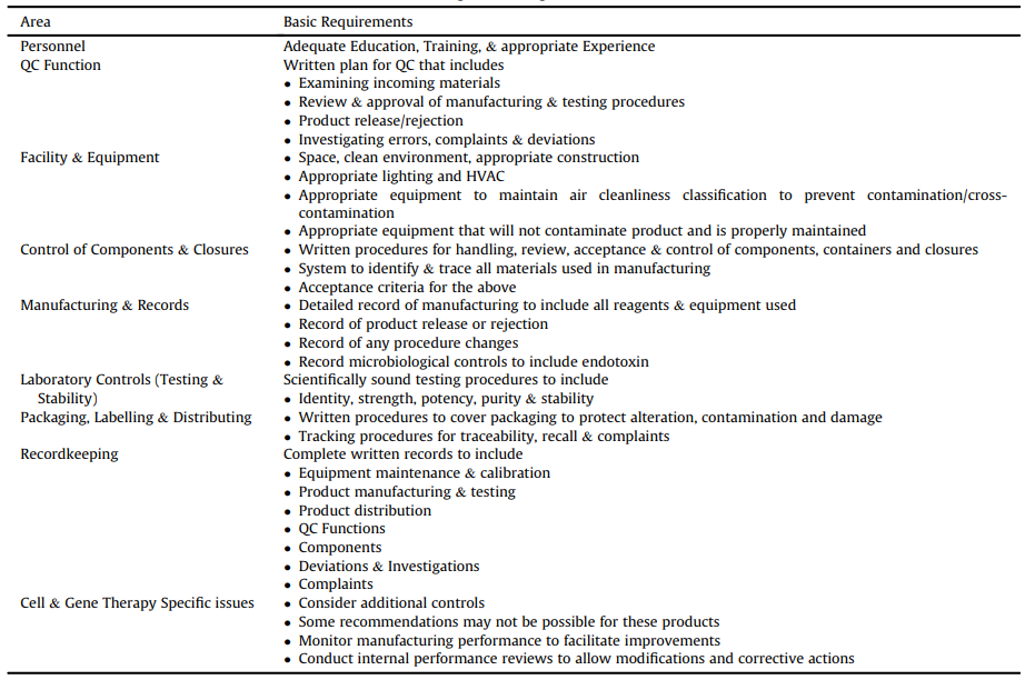 GMP法規(guī)見美國Federal Regulations第21篇的各個(gè)章節(jié)。它們涵蓋各種產(chǎn)品的制造,包括食品、小分子藥物等。CAR-T最相關(guān)的章節(jié)在第210和211部分中介紹,在FDA指南“CGMP for Phase I Investigational Drugs”中簡要介紹了用于早期臨床試驗(yàn)的生產(chǎn)要求。討論的關(guān)鍵領(lǐng)域如表1所示,其中包括一個(gè)專門的章節(jié),涵蓋與細(xì)胞和基因治療產(chǎn)品相關(guān)的問題。
