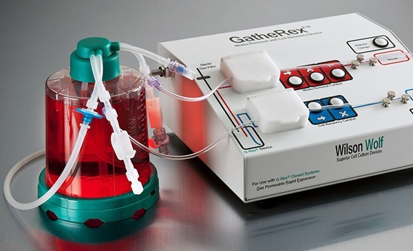 G-Rex專為懸浮細(xì)胞培養(yǎng)設(shè)計(jì),氧氣從底部透氣膜滲透進(jìn)入培養(yǎng)體系,細(xì)胞自然沉降至培養(yǎng)瓶底部,葡萄糖等營養(yǎng)物質(zhì)自然對(duì)流至細(xì)胞,細(xì)胞可以用GatherRex(Wilson Wolf Manufacturing)收集至轉(zhuǎn)移包中進(jìn)行下游處理。