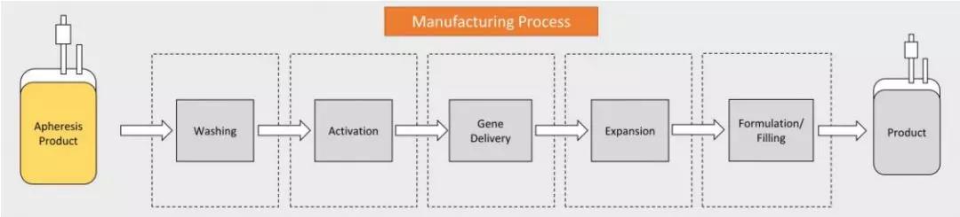 首先,通過白細胞分離術分離患者的白細胞(WBC)并洗滌。然后,激活T細胞,用CAR轉基因轉導,擴增至所需的細胞數量用于治療,制劑生產和灌裝。在對患者進行質量控制測試和預備性淋巴清除化學療法后,將產品注射到患者體內。
